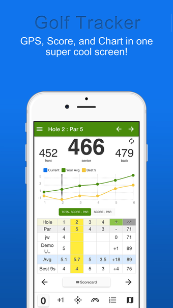 ميزة بارزة هي القدرة على تتبع الإحصائيات بشكل متزامن مع الأصدقاء، بالإضافة إلى رسم بياني فريد يتيح للاعبين المنافسة ضد متوسط وأفضل نتائجهم في الوقت الحقيقي. يقدم التطبيق أيضًا تحديثات GPS ذكية، وحدات مسافة قابلة للتخصيص، وتفاصيل جولة شاملة مثل ظروف الطقس، ملاحظات الملعب، والرهانات.